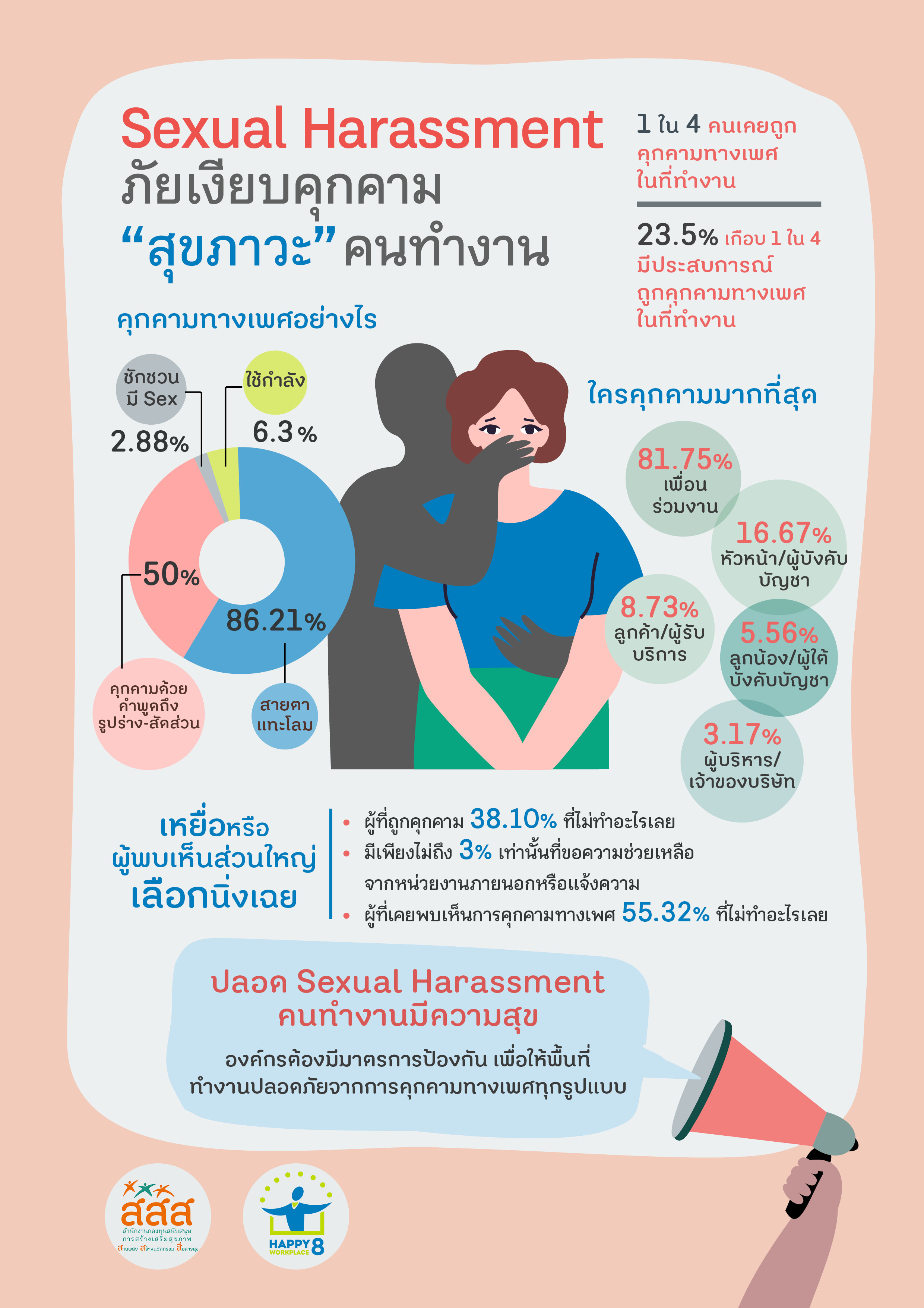 จากการสำรวจสถานการณ์ด้านการคุกคามทางเพศในสถานที่ทำงาน สสส. ร่วมกับนิด้าโพล พบว่ามี 23.5% หรือเกือบ 1 ใน 4 มีประสบการณ์ถูกคุกคามทางเพศในที่ทำงาน มากที่สุด คือ สายตาแทะโลม 86.21% คุกคามด้วยคำพูดถึงรูปร่าง-สัดส่วน 50% ถึงขั้นชักชวนมี Sex 2.88% และหนักสุดใช้กำลัง 6.3% แต่เหยื่อหรือผู้พบเห็นส่วนใหญ่เลือกนิ่งเฉย